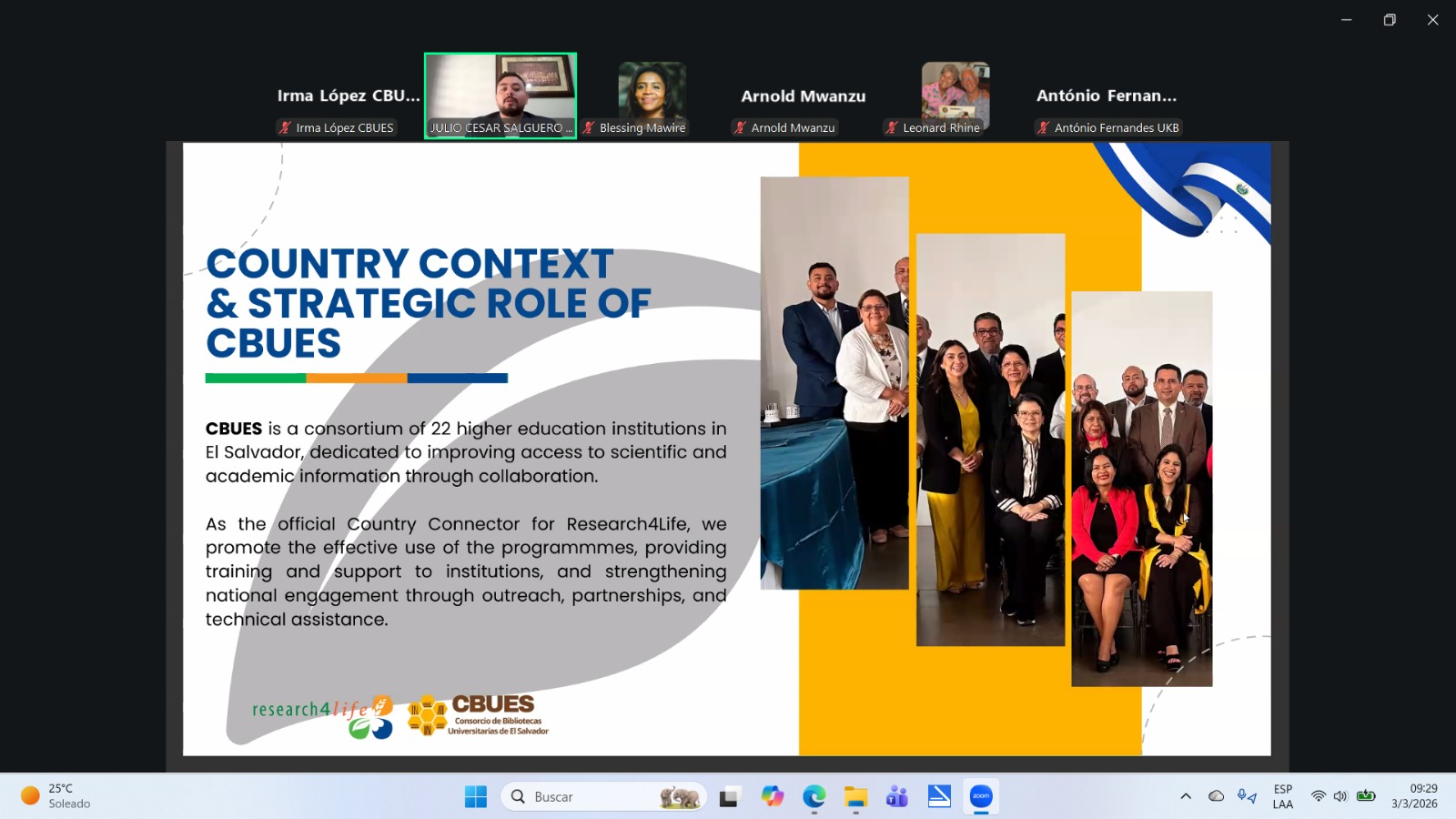 El Consorcio de Bibliotecas Universitarias de El Salvador (CBUES), mediante la representación de Cesar Salguero (informático de la Oficina Técnica), participó como ponente en la Reunión Global de Conectores de País de Research4Life, un importante espacio internacional de diálogo, intercambio y articulación que reunió a representantes de distintos países comprometidos con la promoción del acceso equitativo a la información científica y académica.